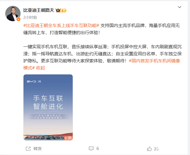 8月13日,比亚迪王朝网销售事业部总经理路天今日在社交媒体平台上发文表示,比亚迪王朝全车系正式上线手车互联功能。该功能支持国内所有主流手机品牌,实现海量手机应用无缝流转上车,为车主带来全新便捷体验。