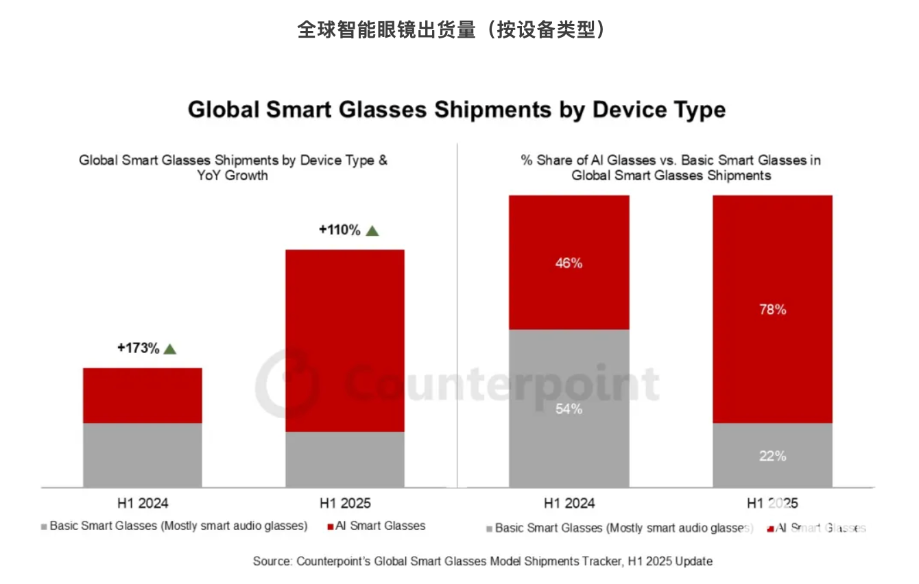 Counterpoint 发布的《全球智能眼镜出货量追踪报告》显示,2025年上半年,全球智能眼镜市场出货量同比增长110%,增长势头迅猛。