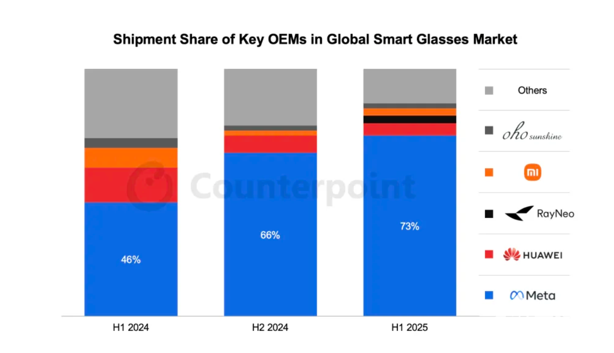 这一显著增长主要得益于Ray-Ban Meta智能眼镜的强劲需求。同时,小米、雷鸟科技等新进入者以及一些较小品牌的加入,也为市场注入新活力。尤其值得注意的是,AI智能眼镜在2025年上半年占智能眼镜总出货量的78%,较2024年上半年的46%和2024年下半年的66%大幅提升,AI 眼镜细分市场同比增长超250%,远超整体市场增速,Ray-Ban Meta AI眼镜在其中占据主导地位。