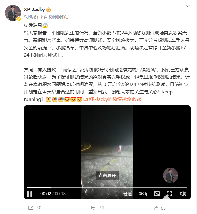 8月14日,小鹏汽车动力总成高级总监发文表示,全新小鹏P7的24小时耐力测试现场突发恶劣天气,在充分考虑测试车手人身安全的前提下,小鹏汽车、中汽中心及场地方汇商后现场决定暂停全新小鹏P7 24小时耐力测试。