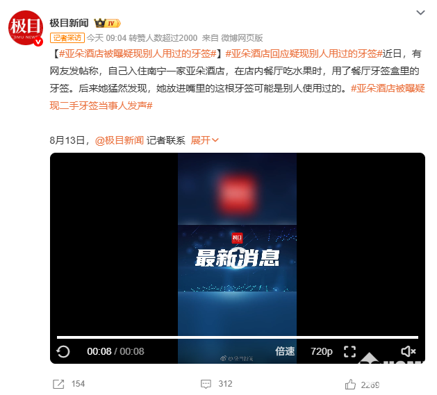 极目新闻记者昨日联系了该女士了解到,她于8月10日,入住南宁五象总部基地亚朵酒店,酒店时价为每晚430 元。12日上午,她使用了餐厅牙签盒里的牙签。起初,她并未察觉异样,直到拿第二包牙签时,她才发现一包完整的牙签包里应有两根,而第一包牙签的包装有被撕裂的痕迹,她这才惊觉自己可能用了别人用过的牙签。方女士通过 12315 与 12345 投诉,当地相关部门表示已记录情况,需几个工作日处理,当天她也向警方报了案,但警方表示此事不属于管辖范围。方女士称,酒店工作人员当时承认疏忽管理,未检查桌面一次性用品,仅打扫了桌面垃圾。而酒店给出的说法前后不一,上午称通过监控未发现有客人使用过牙签,中午又改称前一晚有小孩使用过牙签并放回牙签盒,方女士要求查看监控,酒店并未提供。
