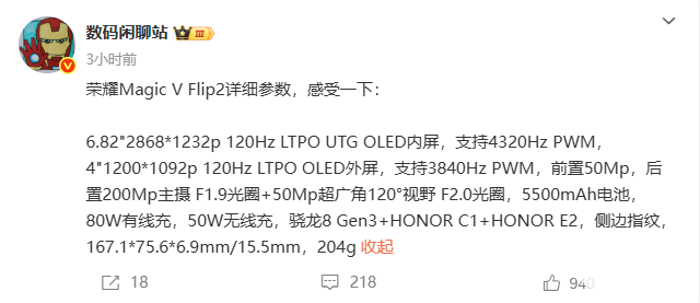 据爆料,核心配置上,荣耀Magic V Flip2搭载骁龙8 Gen3,并且搭配了荣耀自研的HONOR C1、HONOR E2芯片。屏幕尺寸上与前代保持一致,采用6.82英寸的LTPO内屏,覆盖UTG玻璃,拥有2868*1232p分辨率、120Hz刷新率、4320Hz PWM高频调光。外屏是4英寸的LTPO,拥有1200*1092p分辨率、120Hz刷新率、3840Hz PWM高频调光。影像方面,内屏有一颗居中挖孔前摄,拥有5000万高像素;后置双摄也是挖孔方案,主摄是2亿像素,拥有F1.9光圈,还配有一颗120°视野的5000万像素超广角镜头。续航方面,内置5500mAh电池,支持80W有线快充+50W无线快充。整机三围167.1*75.6*6.9mm/15.5mm,重量204g,采用侧边指纹方案。