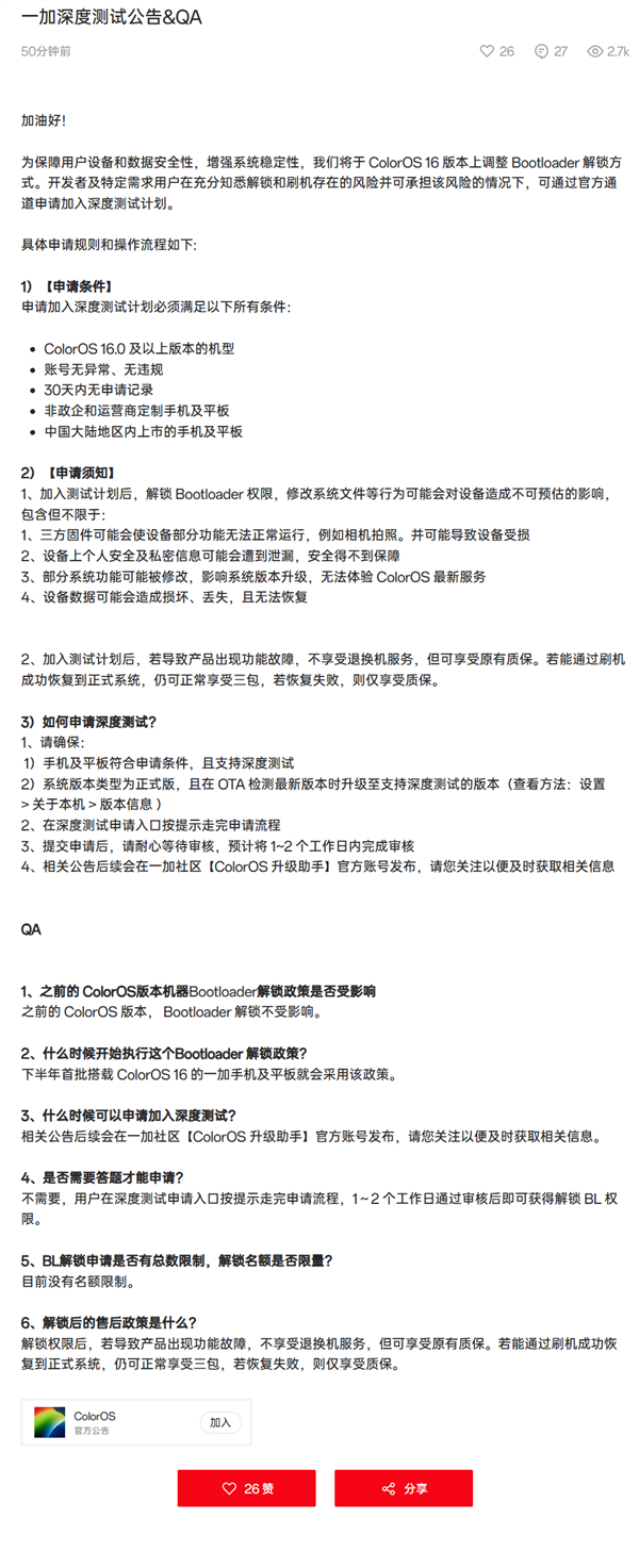 2025年8月14日,一加手机发布公告称,为保障用户设备和数据安全性,增强系统稳定性,ColorOS 16将上调Bootloader解锁方式,下半年首批搭载ColorOS 16的一加手机及平板就会采用新政策。