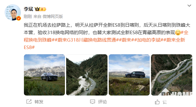 今日,蔚来汽车CEO李斌近日在社交媒体上透露,他正前往拉萨,计划驾驶全新ES8从拉萨出发,途经日喀则,最终抵达珠峰大本营,验收蔚来318川藏换电网络的贯通情况,测试全新ES8在青藏高原的性能表现。