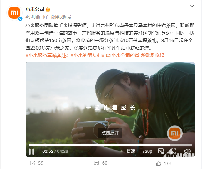 据官方介绍,贵州黔东南丹寨县马寨村位于北纬26°、海拔998米的群山上,虽然山高路远,但村民凭借一双双勤劳的手,在石缝间躬耕出满山青翠,种出了属于他们的幸福与美好。小米服务此前认领帮扶了当地150亩扶贫茶园,并将这片茶园的收成——富含硒、锌的一级红茶,制成10万份茶礼,随同本次公益故事的卡片,已送至全国2000多家小米之家、服务中心门店。并且为茶园内辛勤劳作的村民们和马寨村小学送去了空调、冰箱、洗衣机、电视等家电产品,还为村民们免费提供了手机清洁和贴膜服务。