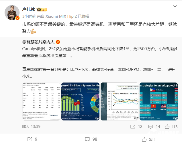 8月14日,据PChome此前报道,第二季度小米在东南亚出货量达470万台,市场份额为19%,同比增长8%,重夺东南亚手机市场份额第一。今日小米集团合伙人、总裁,手机部总裁,小米品牌总经理卢伟冰发文对此表示,市场份额不是最关键的,最关键还是高端机,离苹果和三星还是有较大差距。
