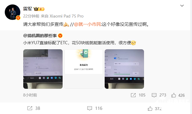 8月14日,有网友今日在社交媒体平台上发文称,小米YU7直接标配了ETC,花50块钱就能激活使用,很方便。随后有网友在评论区表示这个之前没有看见宣传过。小米创办人,董事长兼CEO雷军回复该网友评论表示,“请大家帮我们多宣传。”