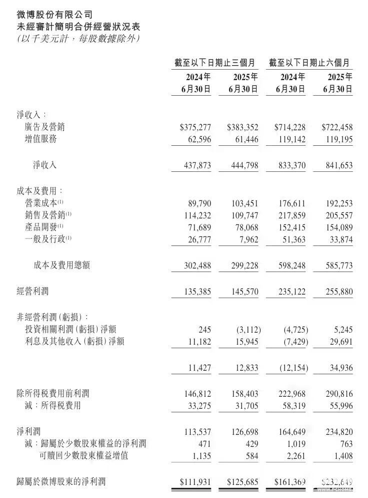 8月14日,微博发布2025年第二季度财报。数据显示,公司当季净收入达4.45亿美元(约合31.95亿元人民币),同比增长2%;归属于微博股东的净利润为1.26亿美元(约合9.05亿元人民币)。按非公认会计准则计算,净利润为1.43亿美元(约合10.27亿元人民币)。