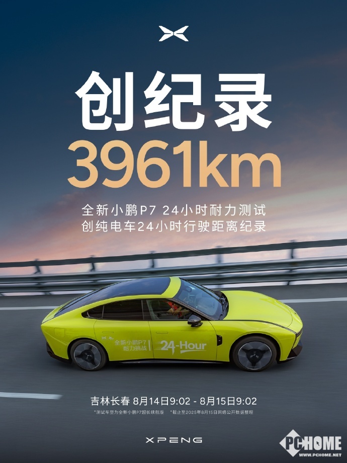 8月15日,小鹏汽车官方宣布,全新小鹏P7在24小时耐力测试中,以总行驶里程3961公里的成绩,刷新了纯电动汽车的同类测试纪录。此次测试于吉林长春进行,时间为8月14日9:02至8月15日9:02。