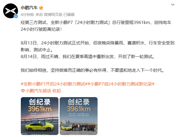 8月15日,小鹏汽车官方宣布,全新小鹏P7在24小时耐力测试中,以总行驶里程3961公里的成绩,刷新了纯电动汽车的同类测试纪录。