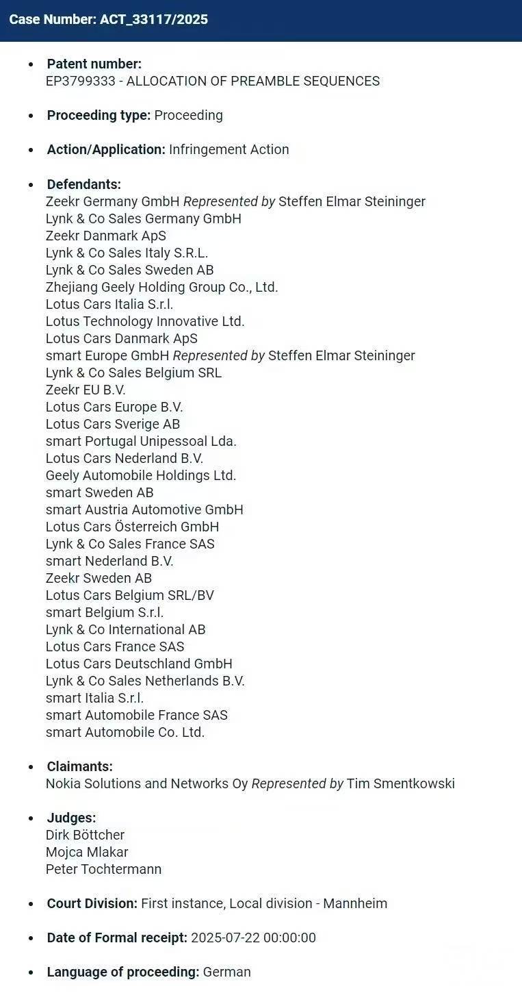 8月15日,据海外知识产权媒体IP Fray上周报道,德国曼海姆地方法院日前受理了一起涉及通信技术专利的诉讼案件。根据法院公开文件(案号:ACT_33117/2025),诺基亚子公司(Nokia Solutions and Networks Oy)于7月22日向吉利集团及其旗下极氪、领克、路特斯和Smart等品牌在欧洲的32家分公司提起专利侵权诉讼,被告方涵盖吉利控股集团及其子公司,涉及德国、丹麦、意大利等18个欧洲国家市场。