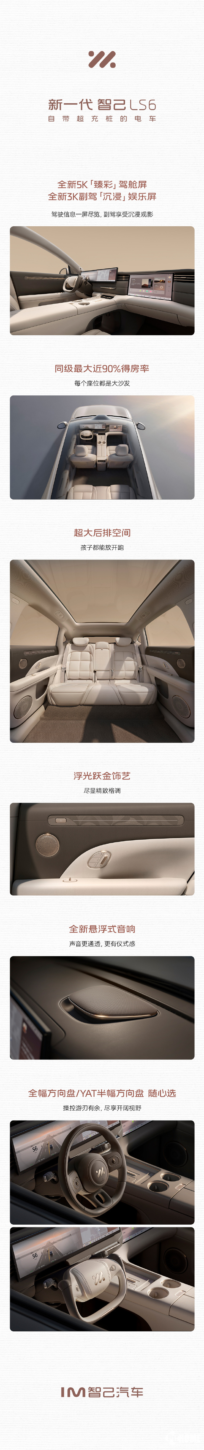 在车内空间方面,LS6的空间利用率达到90%,配备超过1米的后排腿部空间和11升冷暖冰箱,并搭载3K沉浸式娱乐屏,旨在提升乘坐舒适性与娱乐体验。