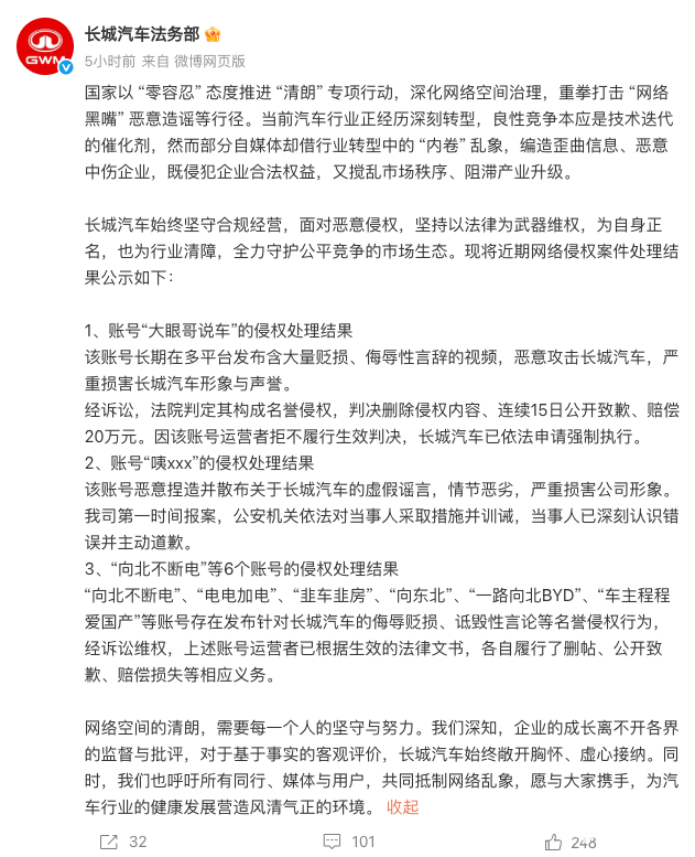 在国家推进“清朗”专项行动、严打“网络黑嘴”的背景下,长城汽车于2025年8月15日通过官方微博公示了近期网络侵权案件的处理结果,以法律手段维护企业合法权益,为汽车行业公平竞争环境“清障”。