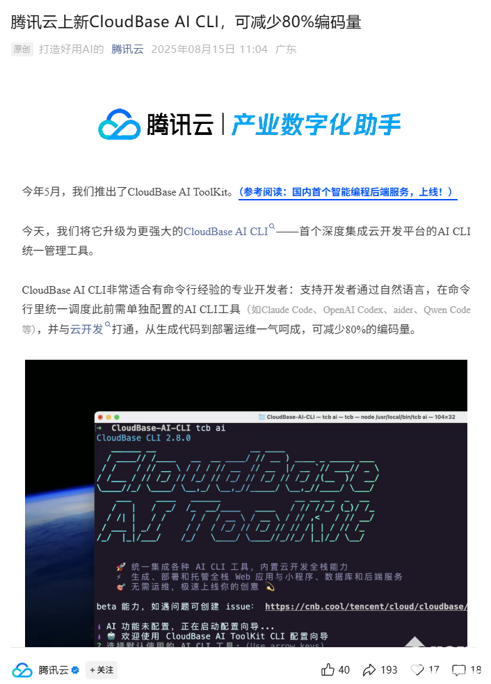 8月15日,今年5月,腾讯云推出国内首个智能编程后端服务CloudBase AI ToolKit。今日,腾讯云官方发文宣布,将其升级成CloudBase AI CLI——首个深度集成云开发平台的AI CLI统一管理工具。