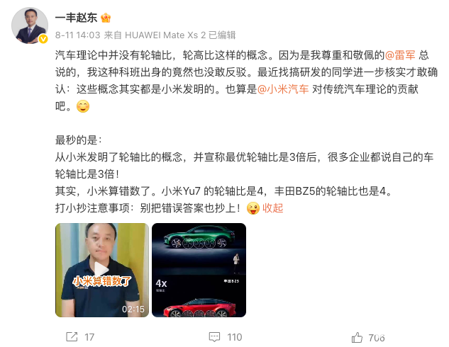 赵东表示,小米YU7车型宣称的“轮轴比”是3倍,但按照实际测量,应为4倍,且小米在PPT中引用丰田车型的数据同样算错。并称“轮轴比”这个概念是小米新发明的。昨日晚间,赵东也在社交媒体平台上发布视频向小米致歉