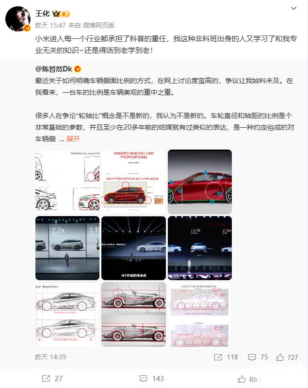 昨日,汽车领域资深博主“陈哲然Dk”发布技术分析指出,以车轮直径与轴距比例衡量车辆设计的方法已有百年历史,并非小米汽车首创的新兴概念。小米集团公关部总经理王化关注到这条微博,转发时写道:“小米进入每一个行业都承担了科普的重任,我这种非科班出身的人又学习了和我专业无关的知识~还是得活到老学到老!”在评论区他更是在回应网友评论时暗讽了一把赵东,称还好自己不是科班出身。