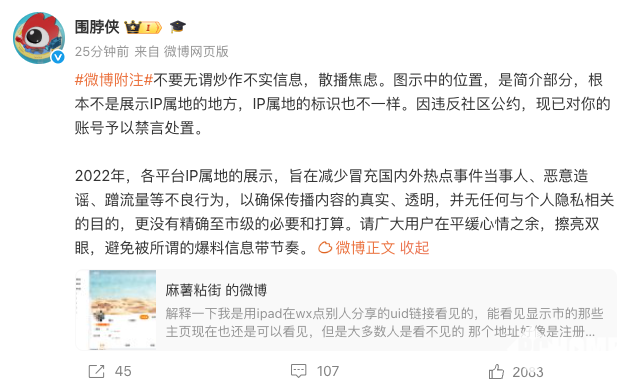 对此,微博社区观察员官方账号“围脖侠”发文称,2022年,各平台IP属地的展示,旨在减少冒充国内外热点事件当事人、恶意造谣、蹭流量等不良行为,以确保传播内容的真实、透明,并无任何与个人隐私相关的目的,更没有精确至市级的必要和打算。
