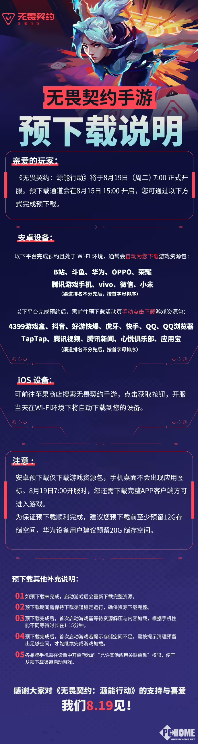 据官方说明,安卓用户可通过B站、斗鱼、华为等平台自动下载资源包,而4399游戏盒、抖音、TapTap等平台需手动下载。iOS用户可直接在App Store预下载,开服后自动安装。需要注意的是,安卓预下载仅包含资源包,开服后仍需下载完整客户端。官方建议预留12G存储空间(华为设备建议20G),以确保顺利安装。