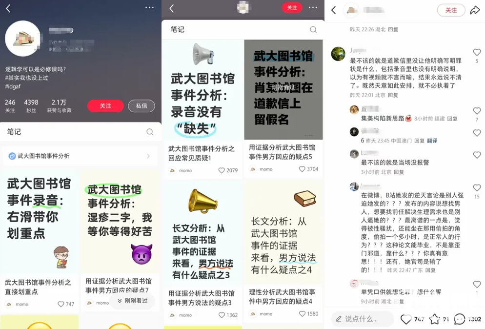 近期,“武汉大学图书馆事件”成为热点,小红书上充斥大量“女权主义”言论,将当事人杨某宣扬为“勇敢对抗性骚扰的女权斗士敢”。即使在相关案件判决之后,杨某遭到反噬,杨某仍然在小红书上“申诉”,大量分析肖某道歉信与录音疑点的笔记,评论互动都有上千条,评论区男女网友针锋相对。