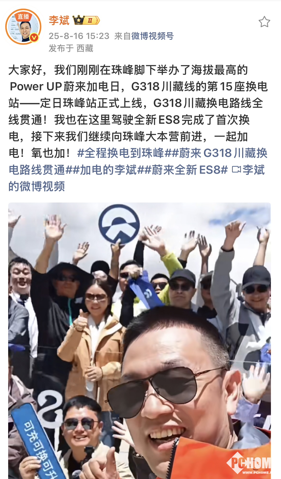 8月16日,蔚来公司创始人、董事长兼CEO李斌亲自验收的G318川藏线,宣布G318川藏线第15座换电站“定日珠峰站”正式投入运营,并举办了Power UP蔚来加电日活动。
