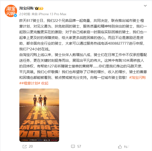8月18日,淘宝闪购官方发文宣布,与阿里和蚂蚁旗下22个品牌共同推出“城市骑士・橙意计划”。该计划将覆盖所有外卖平台骑士,致力于为他们提供更丰厚激励与更全面保障。