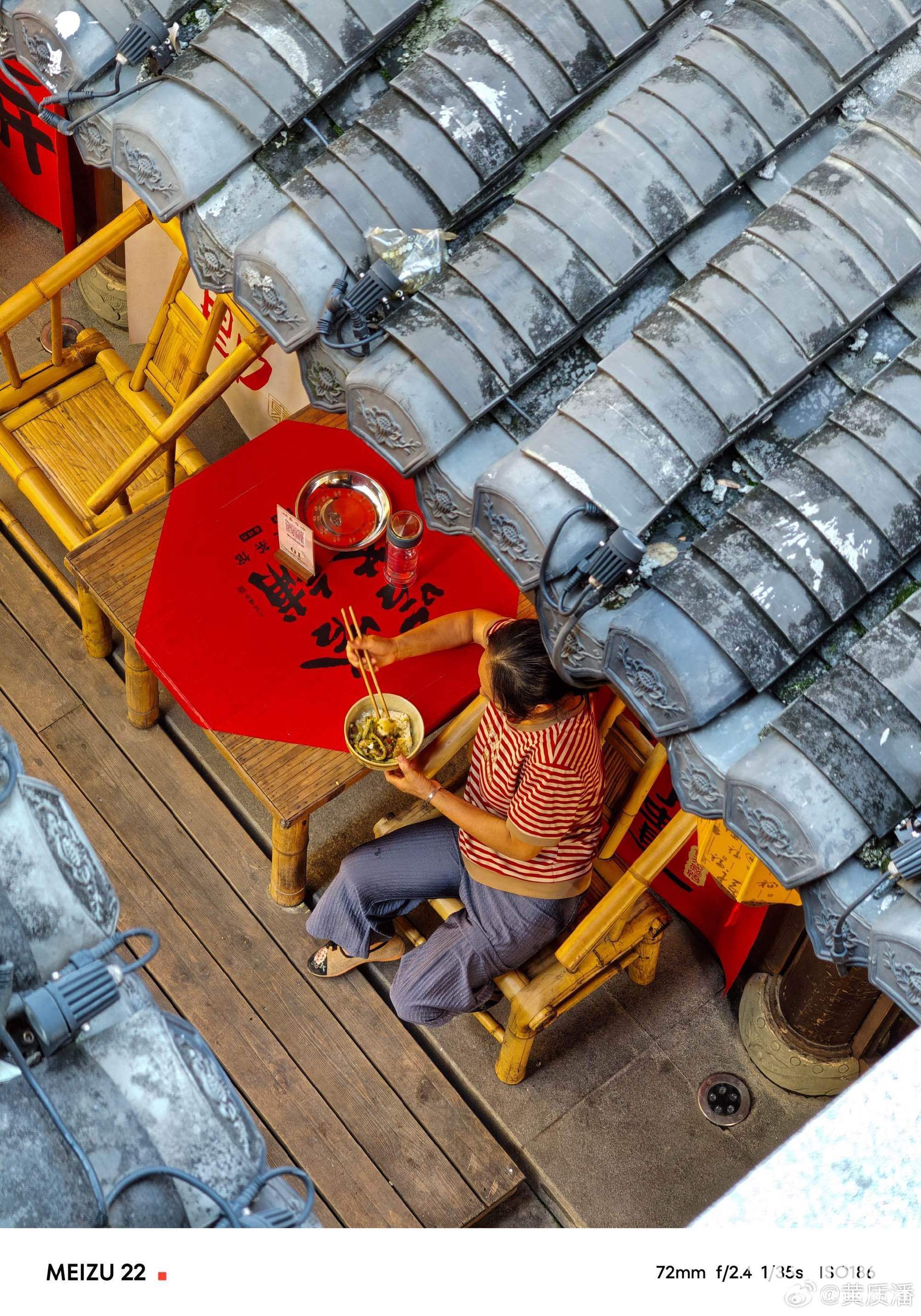 从样张来看,魅族22影像能力有明显提升。 第一张样张呈现俯视视角下的生活场景,古旧瓦片、木质桌椅与人物用餐画面交融,色彩还原精准,红桌文字、人物衣着纹理清晰,展现出出色的细节捕捉力,1/35s快门配合f/2.4光圈,在光线把控上可圈可点,让画面既有生活烟火气,又具视觉质感。