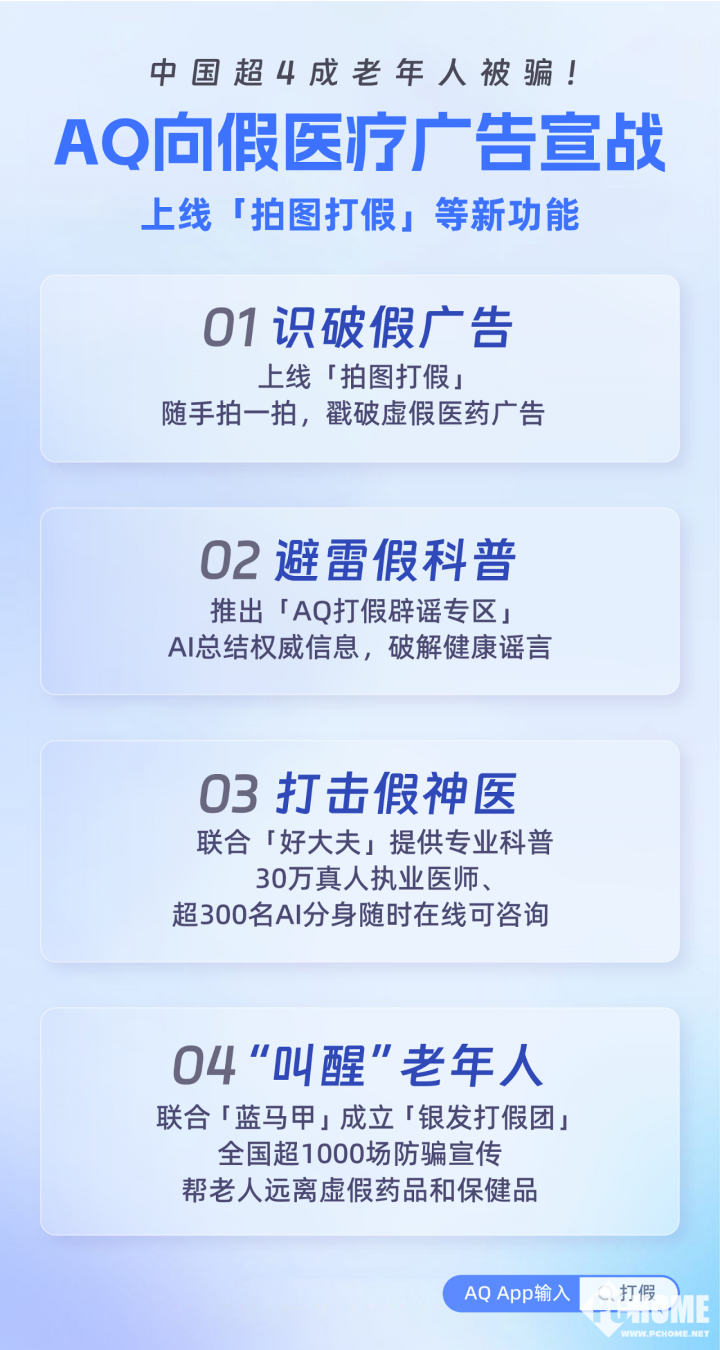 据官方介绍,中国社科院研究数据显示,超四成老年人曾因保健品被骗,因虚假医疗信息被骗的老人也有近三成。情势不容乐观,近期,国家多个部门也正密集开展打击“神医神药”等假广告的整治工作。用户只需在AQ App输入打假,即可快速调用AI拍照打假、AI电话验真、24小时滚动辟谣等打假功能。并且还联合好大夫平台的30万真人执业医师,可随时线上问诊咨询,也上线中国科学院院士等领衔的300多位AI名医分身,24小时“坐诊”。此外,AQ联合蓝马甲公益组织成立“银发打假团”,将在全国各地开展超1000场老人防骗宣传活动,帮爸妈守好养老钱,远离虚假医药和保健品的伤害。