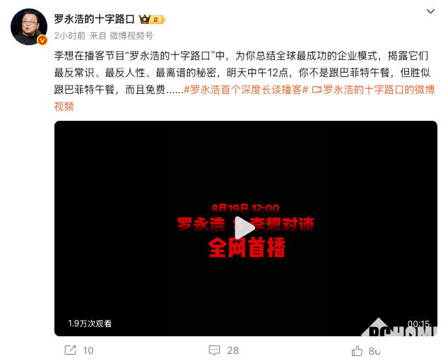 罗永浩在微博表示,自己的播客节目“罗永浩的十字路口”即将于明天中午12点上线,“为你总结全球最成功的企业模式,揭露它们最反常识、最反人性、最离谱的秘密,明天中午12点,你不是跟巴菲特午餐,但胜似跟巴菲特午餐,而且免费”,首期嘉宾是理想汽车CEO李想。