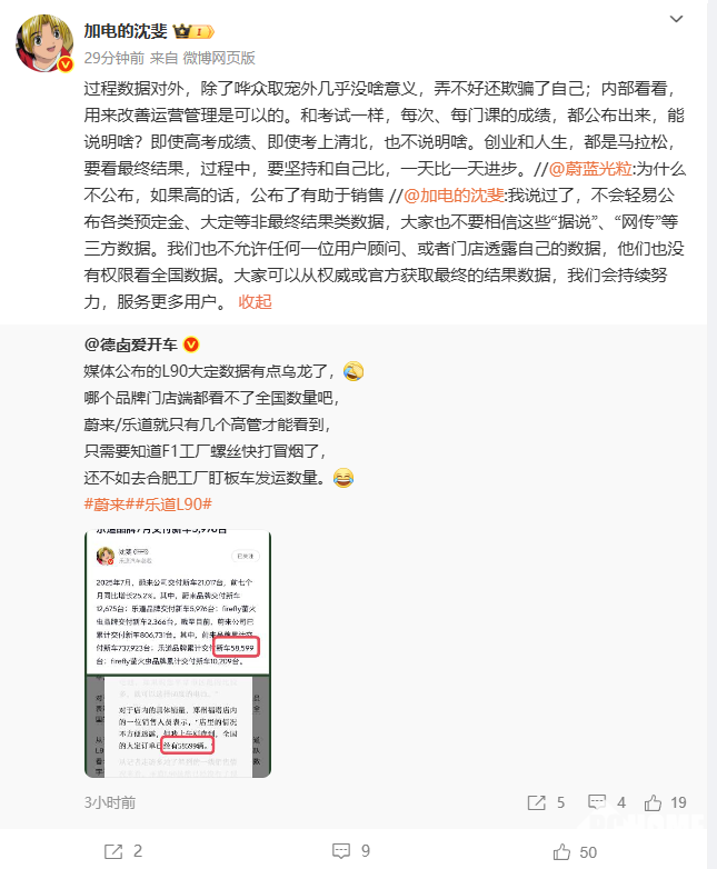 随后有网友问为什么不公布,并且认为如果高的话,公布了有助于销售。对此沈斐回答称,过程数据对外,除了哗众取宠外几乎没意义;内部看看,用来改善运营管理是可以的。据PChome此前报道,8月1日至10日,乐道L90上市短短10天,已累计交付超过4000台。