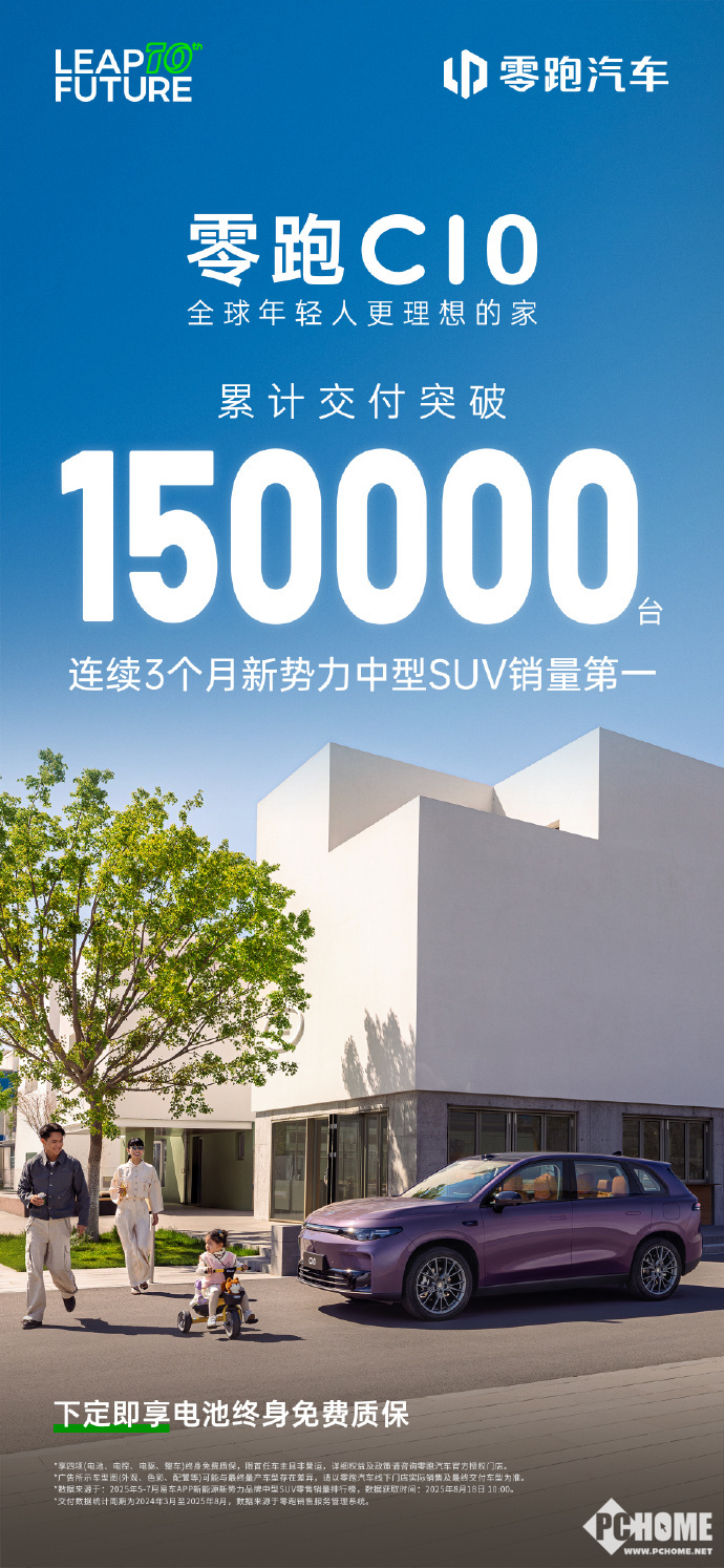 8月18日消息,零跑汽车今日官方宣布,旗下中型SUV零跑C10上市16个月以来,累计交付量突破15万台。自今年5月2026款零跑C10开启交付后,该车型已连续3个月荣登新势力中型SUV销量榜首。