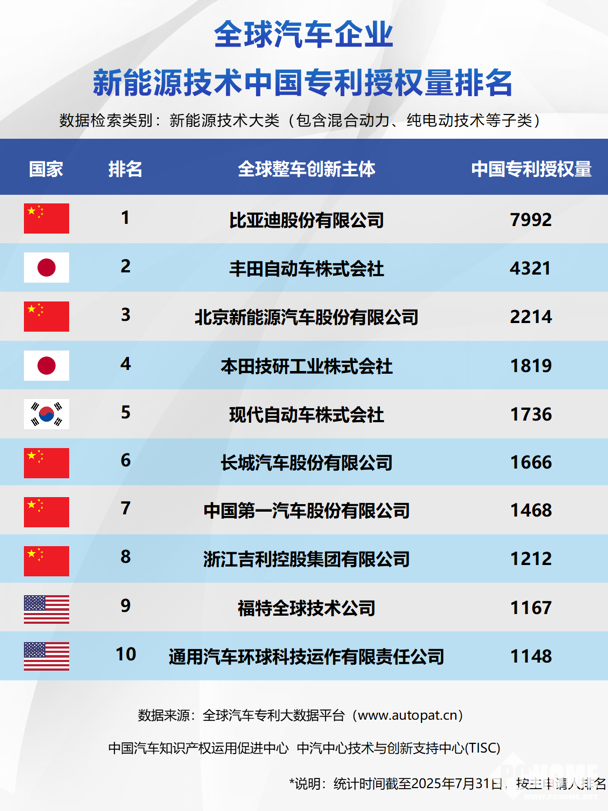 数据检索类别为新能源技术大类(包含混合动力、纯电动技术等子类),统计时间截至2025年7月31日,按主申请人排名。具体排名如下:
