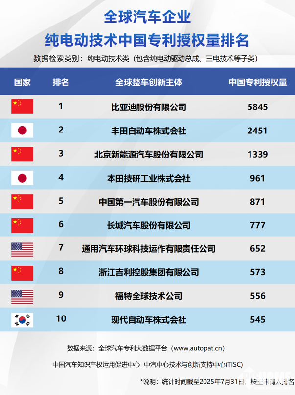 数据检索类别为纯电动技术类(包含纯电动驱动总成、三电技术等子类),统计时间截至2025年7月31日,按主申请人排名。具体排名如下: