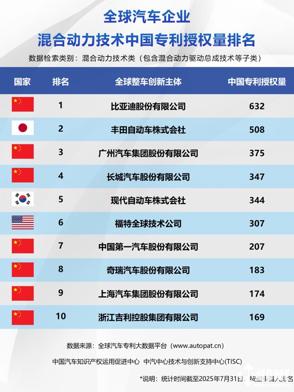 数据检索类别为混合动力技术类(包含混合动力驱动总成技术等子类),统计时间截至2025年7月31日,按主申请人排名。具体排名如下: