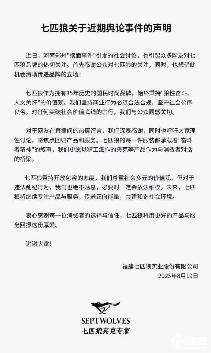 8月19日,七匹狼官方回应“续面事件”。感谢公众对品牌的关注,呼吁公众回归对产品与服务的理性讨论。