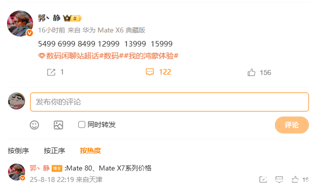 8月19日,近日有博主在社交平台上曝光了华为新一代直屏旗舰Mate 80系列与折叠旗舰Mate X7系列售价。