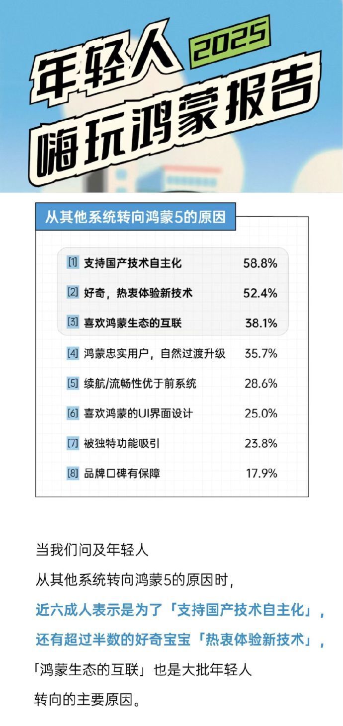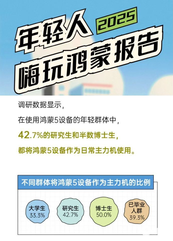8月19日,2025年第一堂HarmonyOS公开课在上海练秋湖研发基地举办,来自全国各地的共200名优秀学生参加活动。影视飓风创始人Tim、华为天才少年代表以及多位华为专家,为学生们带来全方面的鸿蒙干货分享。最新调研数据显示,鸿蒙操作系统在年轻高学历群体中的渗透率持续攀升。根据《2025年轻人嗨玩鸿蒙报告》,42.7%的研究生和50%的博士生将鸿蒙5设备作为日常主力机使用,这一比例显著高于大学生群体的33.3%。