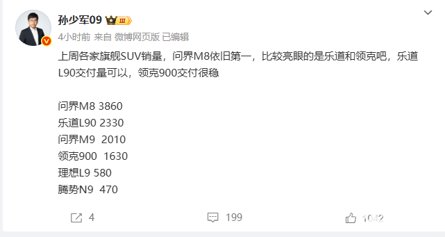 8月19日,据知名汽车博主“孙少军09”爆料上周蔚来公司销量7183台,上升至中国市场新势力品牌销量前四。乐道L90车型从上市至今(上市20天)累计交付6400台,稳居大型SUV周销量榜TOP2。