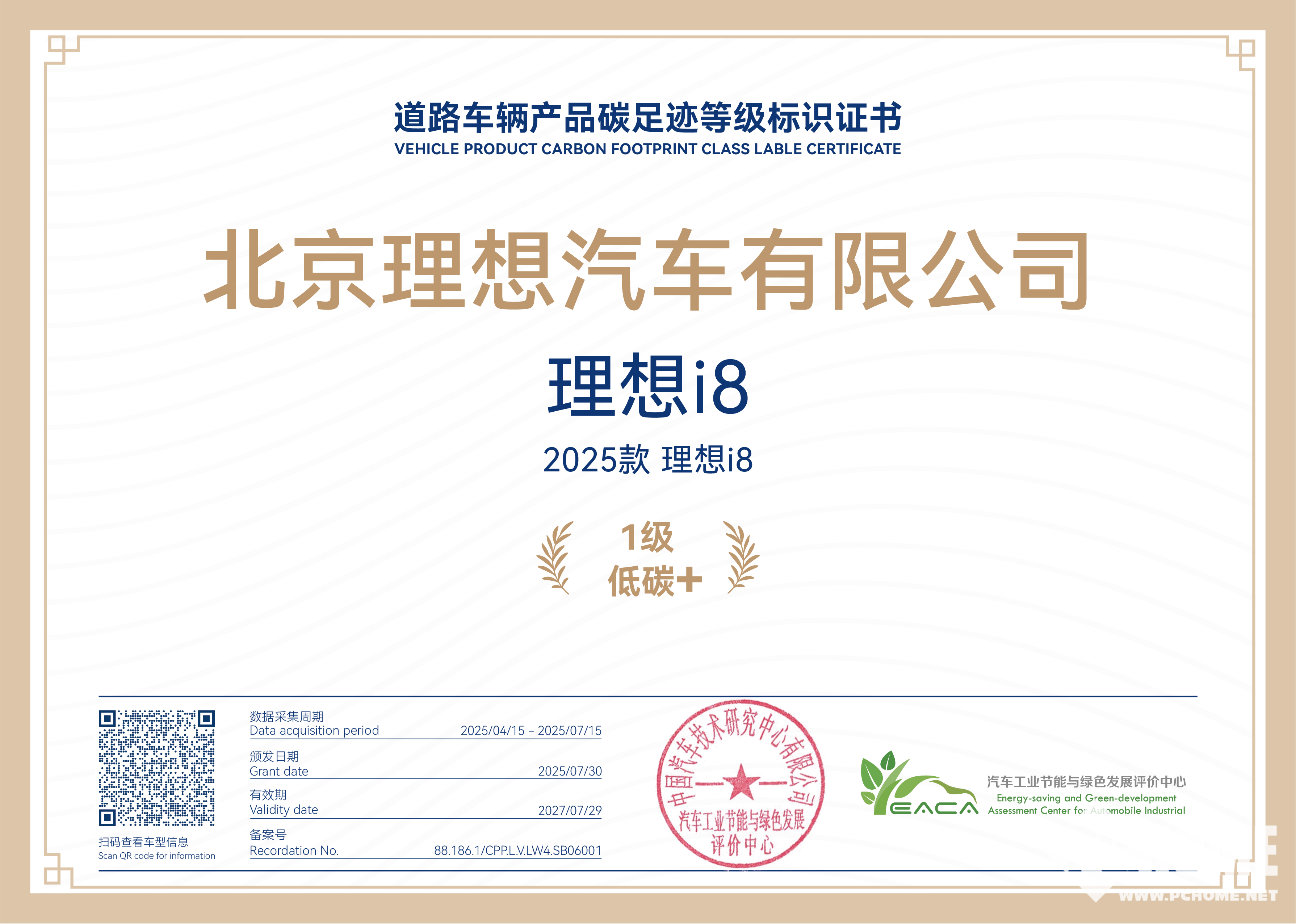 近日,在汽车工业节能与绿色发展评价中心组织的汽车低碳标识等级评定中,理想i8斩获由中汽中心认证的低碳标识最优等级(1级)认证。