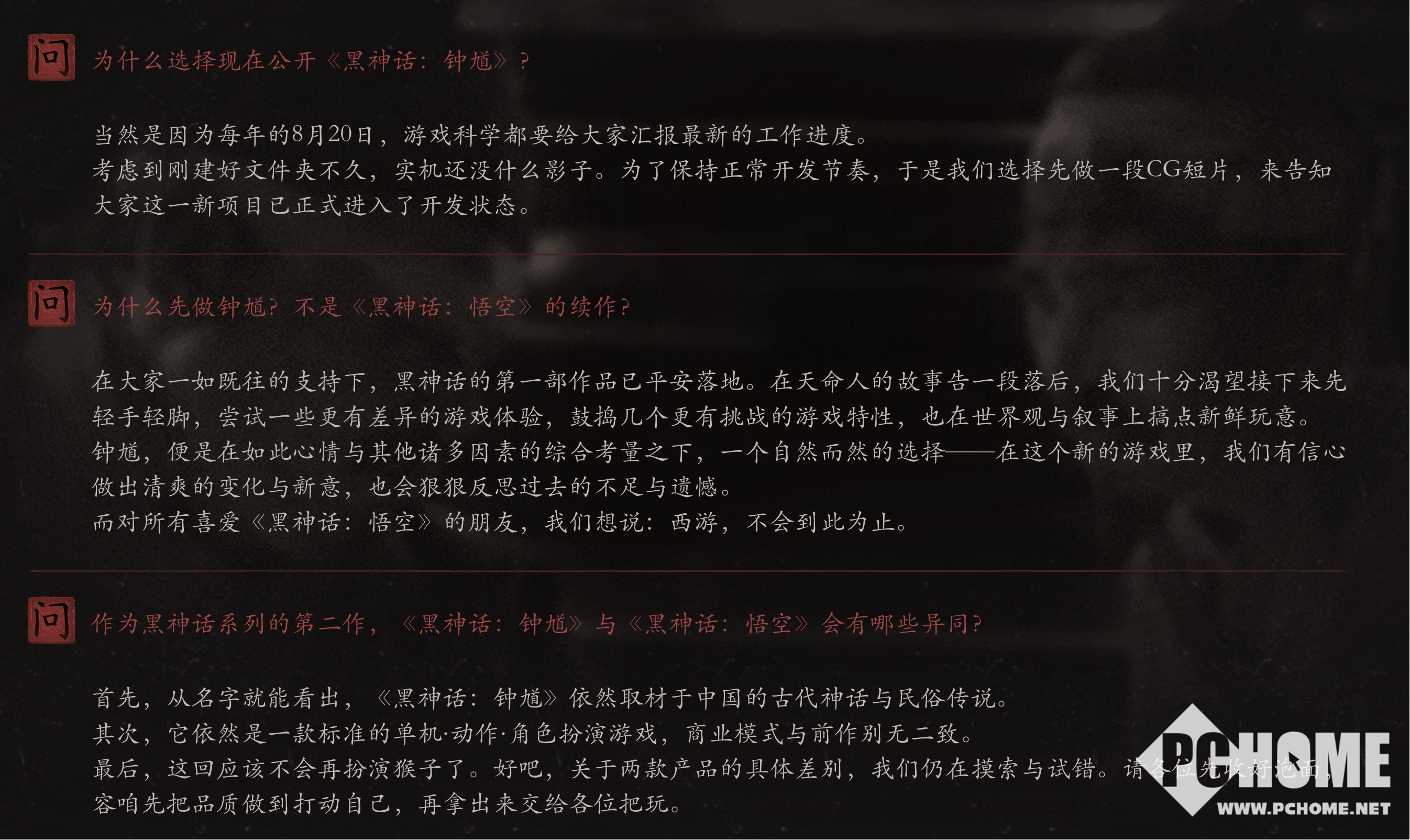 PChome了解到,目前《黑神话:钟馗》官网已经上线。针对为何为什么选择现在公开《黑神话:钟馗》,游戏科学表示,“因为每年的8月20日,游戏科学都要给大家汇报最新的工作进度。”