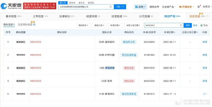 公开信息显示,北京泡泡玛特文化创意有限公司已于今年7月登记该系列新品的作品著作权,类别为美术作品。同时,公司也在多个类别申请注册“MOKOKO”商标,涵盖健身器材、科学仪器、珠宝钟表等,目前部分商标状态仍处于等待实质审查阶段。