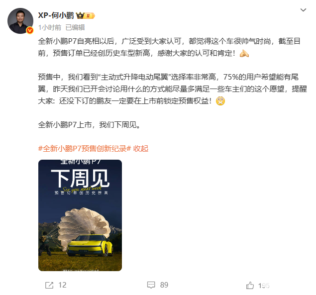 8月20日,小鹏汽车董事长何小鹏今日发文表示,全新小鹏P7的预售订单已经创历史车型新高。
