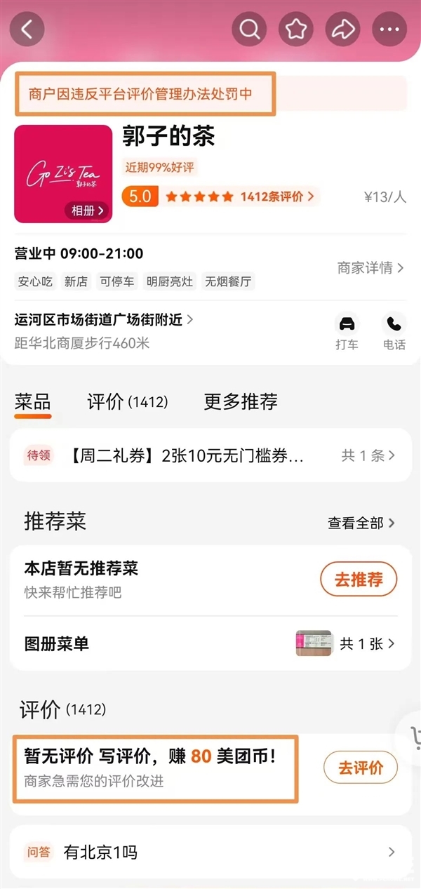 据美团页面显示,“郭子的茶”因违反平台《评价管理办法》被处以处罚,店铺评论功能暂时不可见。目前该店已有上千条评论记录,但消费者无法查看具体内容。有网友推测,或与该店在未正式营业前即收到大量好评有关,平台系统因此判定为违规操作。