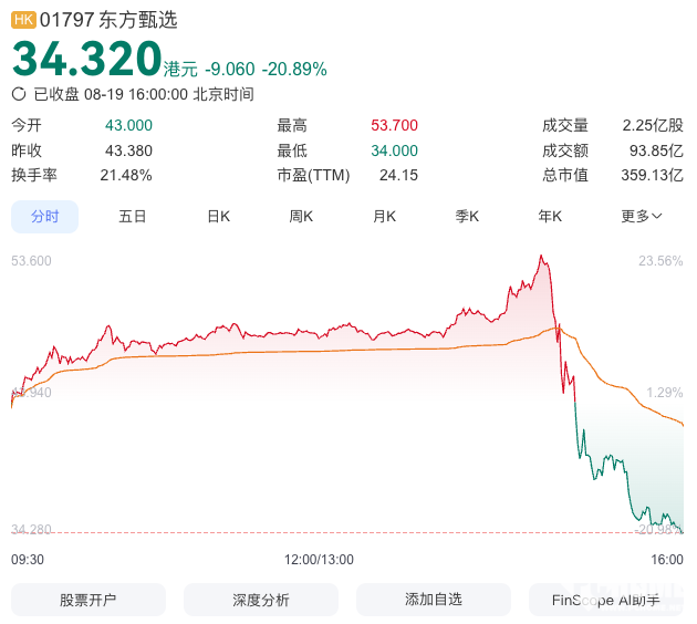 同时PChome了解到,昨日下午,东方甄选股价突然上演高台跳水,14时50分至16时,短短一个多小时,东方甄选股价从上涨23.56%,跳水至下跌20.89%,报收34.32港元/股。