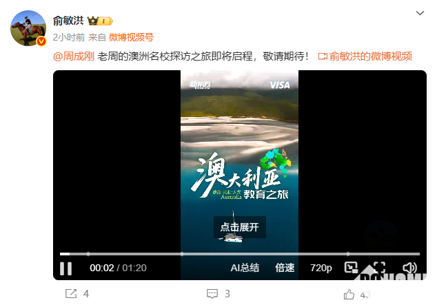 8月20日,新东方教育集团有限公司董事长俞敏洪今日在社交媒体平台上为新东方CEO周成刚的新片《澳大利亚教育之旅》进行预热。俞敏洪表示:老周的澳洲名校探访之旅即将启程,敬请期待!
