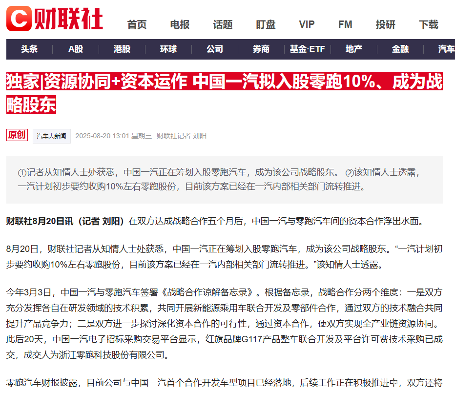 8月20日,据财联社今日报道,据知情人士透露,中国一汽正在筹划入股零跑汽车,成为该公司战略股东。据介绍,一汽计划初步要约收购10%左右零跑股份,目前该方案已经在一汽内部相关部门流转推进。