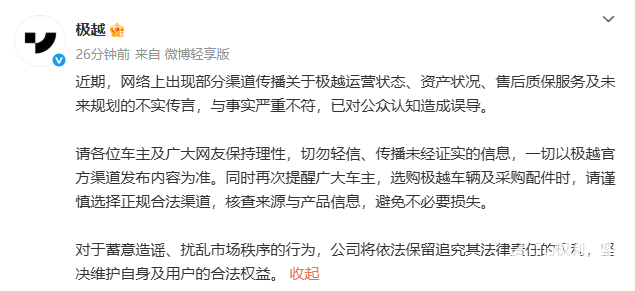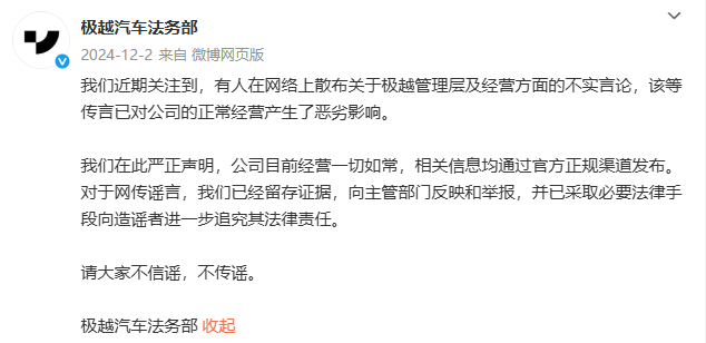 据悉,2024年12月2日,极越汽车法务部针对网络流传的公司管理层变动、大规模裁员、资金链断裂等不实信息发布声明辟谣,称公司经营一切如常,并留存证据将追究造谣者法律责任。