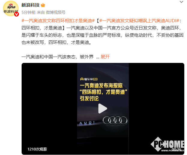 2025年8月20日消息,据新浪科技,一汽奥迪官方账号发文,疑似内涵上汽奥迪AUDI没有奥迪四环标志,其公众号推文称,奥迪四环,是闪耀于车头的标志。四环相扣,才是奥迪。推文评论区显示,有网友称,“奥迪,我只认四环”。
