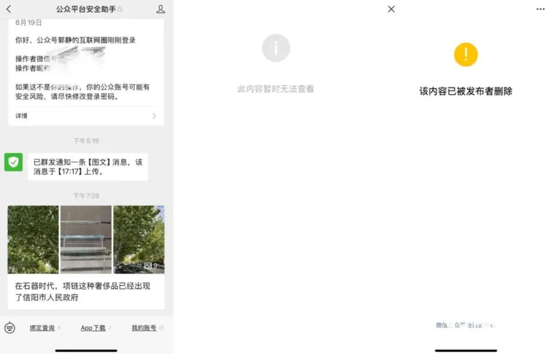 目前,名为《在石器时代,项链这种奢侈品已经出现了》的内容已被“公众平台安全助手”删除,不过由于推送已完成,用户搜索“公众平台安全助手”依然可以看到内容,只是无法点开。