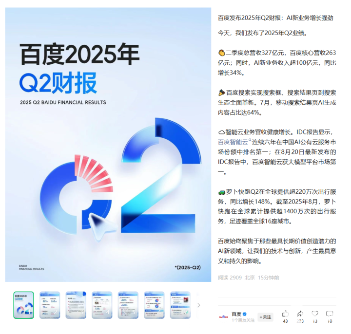 8月20日,百度官方今日发布了2025年Q2财报,二季度总营收327亿元,同比下跌3.6%,百度核心营收263亿元;归属百度核心的净利润为74亿元,同比增长35%,超出市场预期。