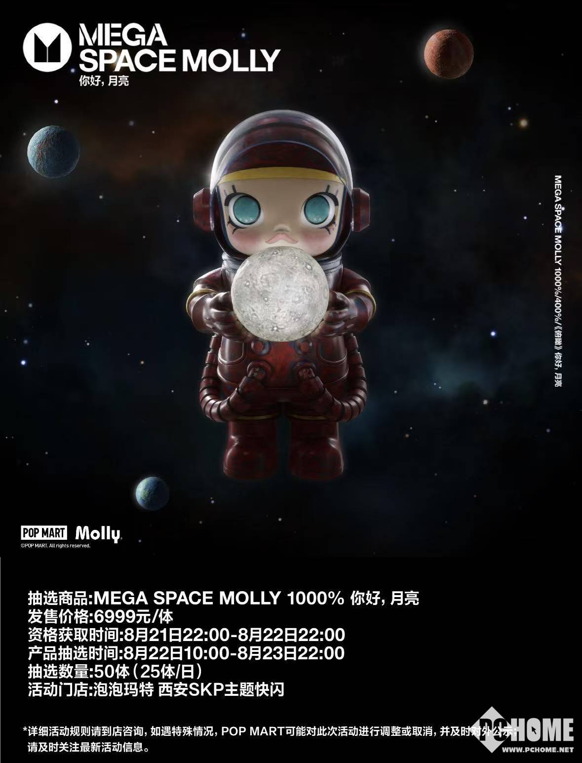 在更大规格的产品中,MEGA SPACE MOLLY 1000%“你好,月亮”将以抽选形式限量发售50体(每日25体),价格为6999元。该环节面向西安SKP主题快闪店参与者,资格获取时间为8月21日22:00至8月22日22:00,抽选时间则设定在8月22日10:00至8月23日22:00。
